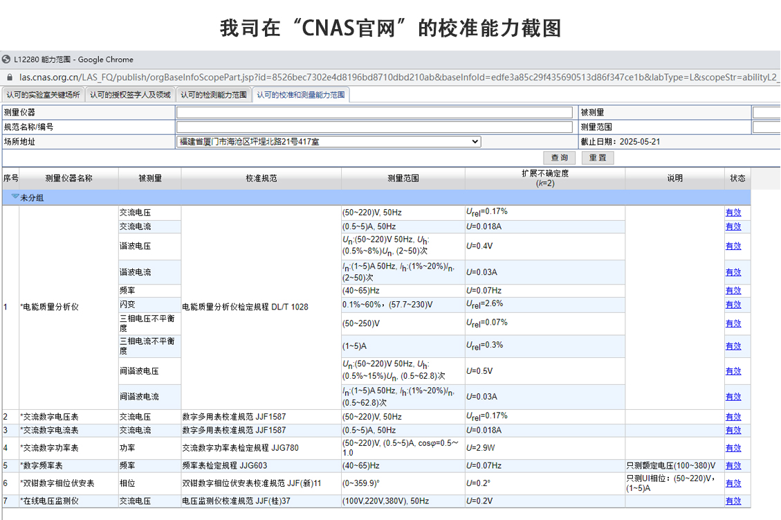 我公司具有電能質(zhì)量分析儀(在線式和便攜式)、電壓表、電流表、相位表、頻率表等相關(guān)監(jiān)測、計量和保護(hù)類表計類校準(zhǔn)CNAS資質(zhì),可根據(jù)具體情況為客戶提供實(shí)驗(yàn)室或現(xiàn)場靈活方式校準(zhǔn)業(yè)務(wù)。